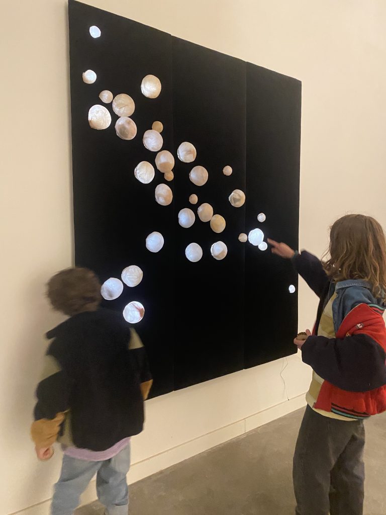 Door gestoffeerd wandpaneel met handgemaakte bollen van textiel, in het paneel is LED licht verwerkt. Afmetingen: 285 x 270 cm.